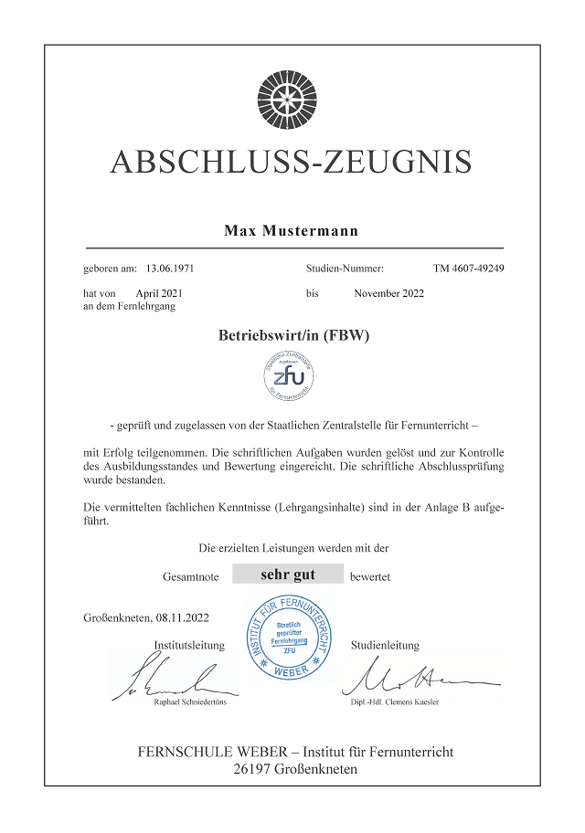 Entsprechend den Ergebnissen der Abschlussprüfung, der Portfolio-Arbeit, der Online-Seminare und der Einsendeklausuren wird Ihnen dann das Fachlehrgangszeugnis der Fernschule Weber erteilt, das als Leistungs- und Fortbildungsnachweis dient.