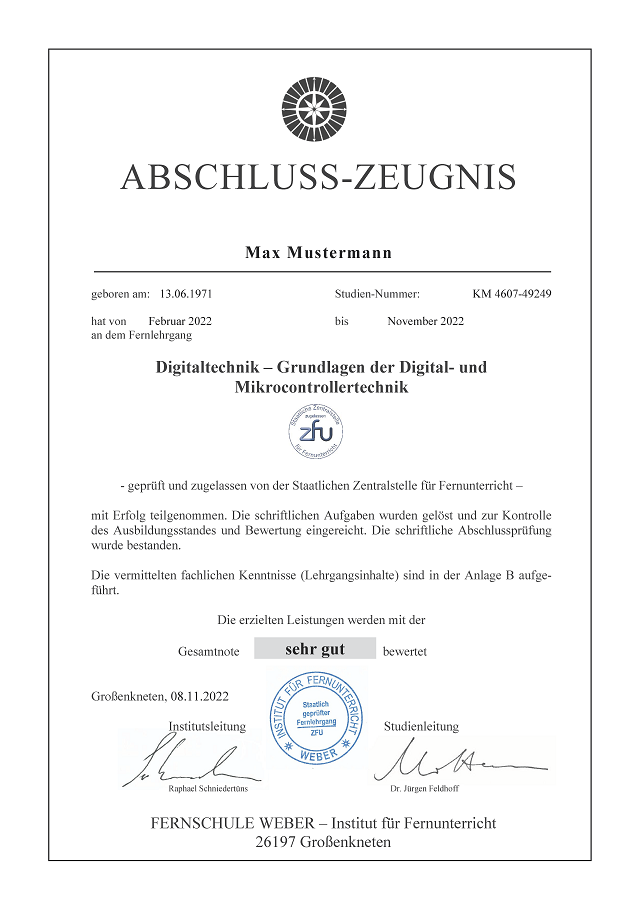 Dieser Fernunterrichtslehrgang ist von der Staatlichen Zentralstelle für Fernunterricht (ZFU) geprüft und unter der Nummer 7358720 zugelassen.