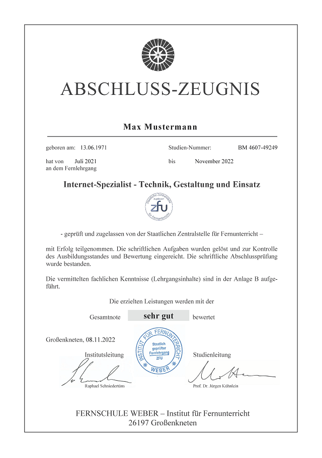 Entsprechend den Ergebnissen der Abschlussprüfung und unter Berücksichtigung der für die Hausaufgaben erteilten Noten wird Ihnen dann das Fachlehrgangszeugnis der Fernschule Weber erteilt, das als Leistungs- und Fortbildungsnachweis dient.