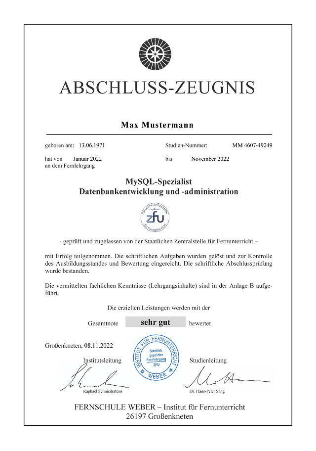 Entsprechend den Ergebnissen der Abschlussprüfung und unter Berücksichtigung der für die Hausaufgaben erteilten Noten wird Ihnen dann das Fachlehrgangszeugnis der Fernschule Weber erteilt, das als Leistungs- und Fortbildungsnachweis dient.