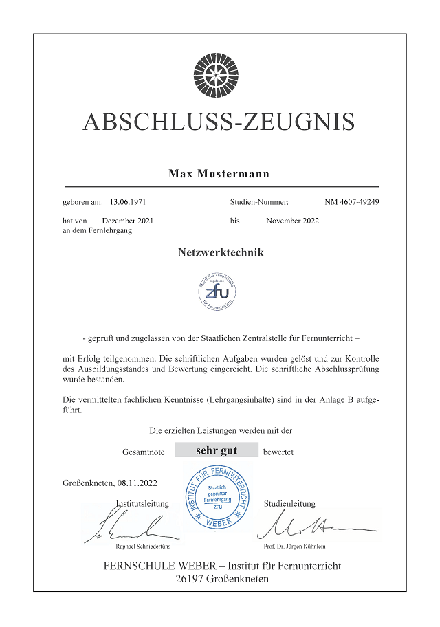 Entsprechend den Ergebnissen der Abschlussprüfung und unter Berücksichtigung der für die Hausaufgaben erteilten Noten wird Ihnen dann das Fachlehrgangszeugnis der Fernschule Weber erteilt, das als Leistungs- und Fortbildungsnachweis dient.