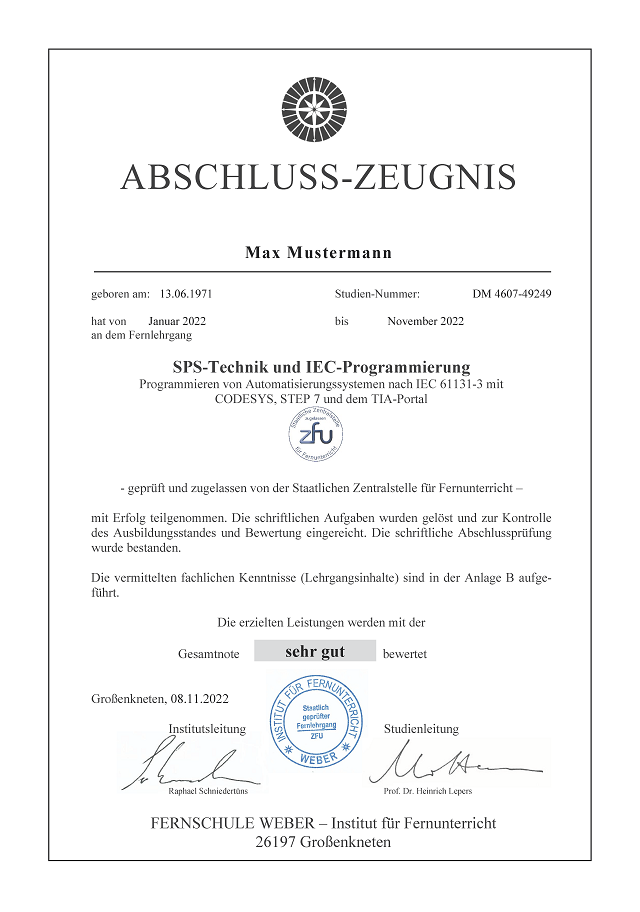 Entsprechend den Ergebnissen der Abschlussprüfung und unter Berücksichtigung der für die Hausaufgaben erteilten Noten wird Ihnen dann das Fachlehrgangszeugnis der Fernschule Weber erteilt, das als Leistungs- und Fortbildungsnachweis dient.