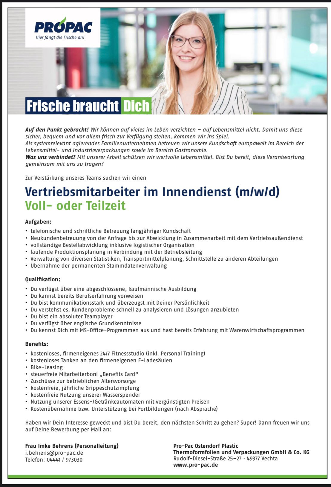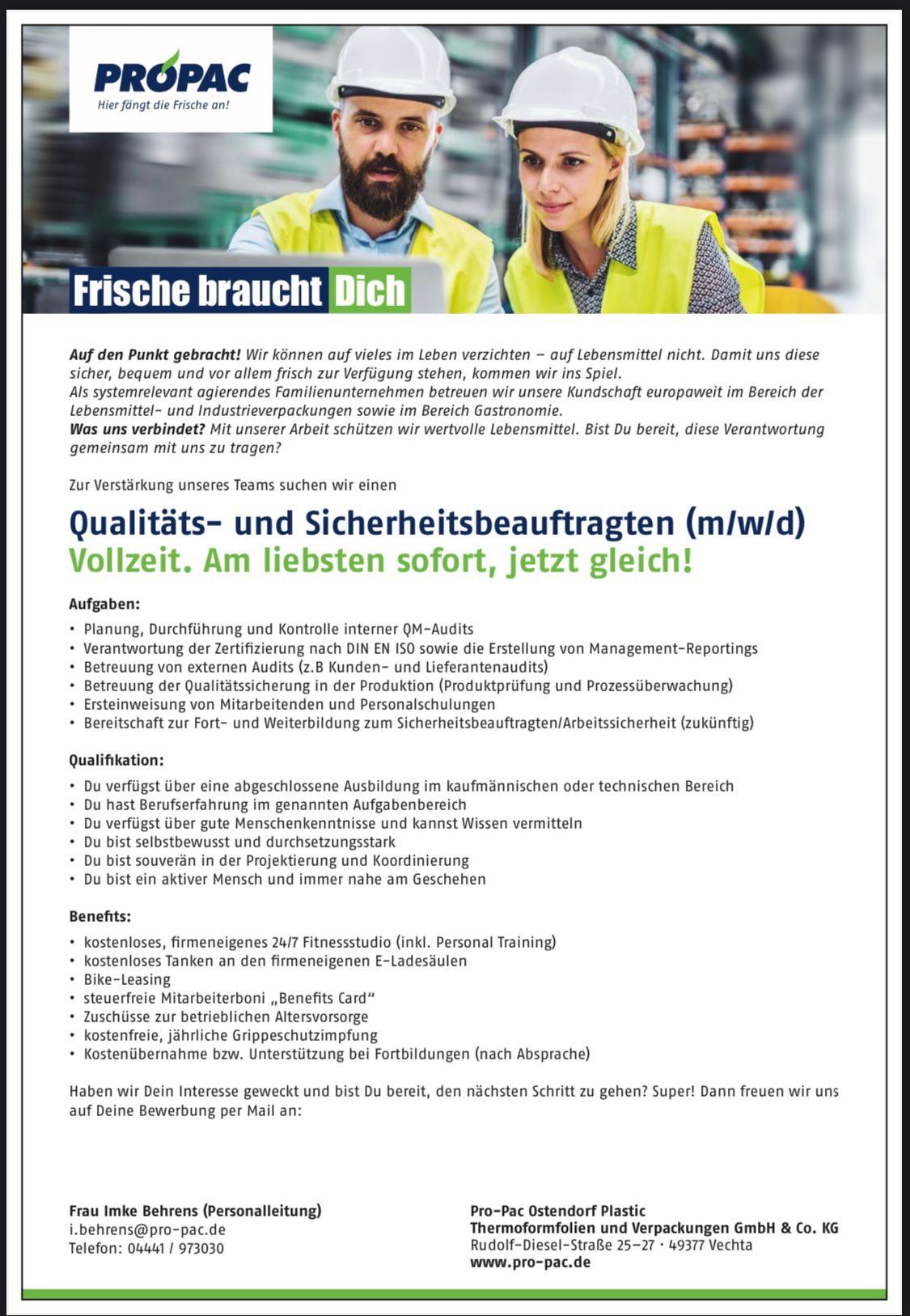 Das Unternehmen Pro-Pac in Vechta sucht einen Qualitäts- und Sicherheitsbeauftragten (m/w/d) sowie einen Vertriebsmitarbeiter im Innendienst (m/w/d).